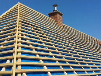 In Hechingen montierte ein Team von Müller & Schwarz einen doppelwandigen Edelstahlschornstein an die Fassade eines Einfamilienhauses mit roter Holzverkleidung.