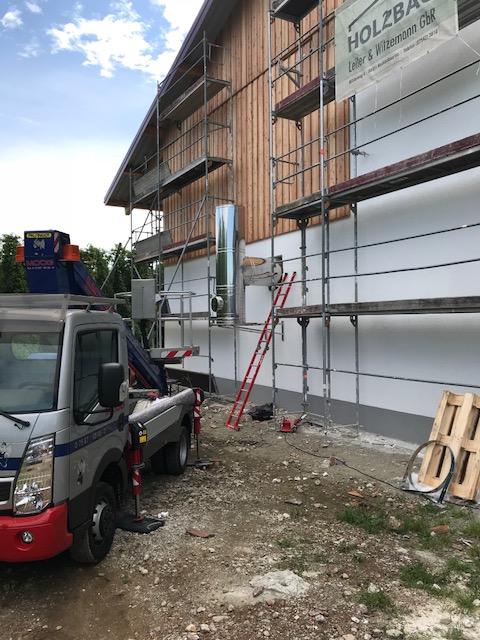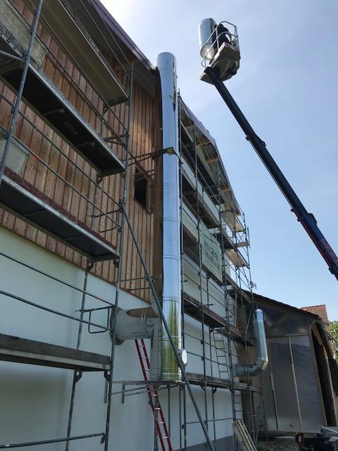 Für die Montage des Edelstahlschornsteins musste eine Hebebühne bestellt werden, denn das Gebäude besaß einige Meter an Höhe.