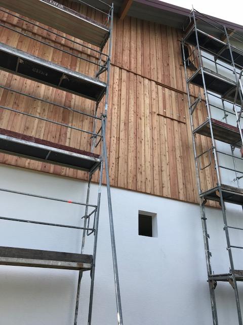 An der Wand eines Bauernhofes mit Holzverkleidung in Tettnang wurde ein Edelstahlschornstein von Müller & Schwarz angebracht.