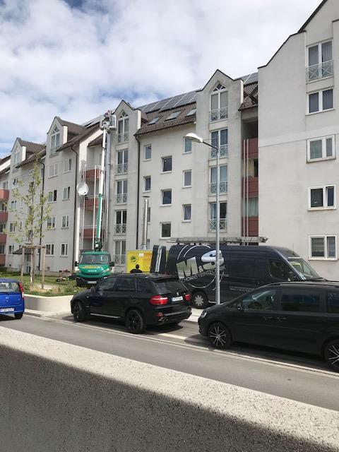 Mithilfe einer Hebebühne wurde dieser doppelwandige Schornstein an der Hauswand eines Mehrfamilienhauses in München angebracht.