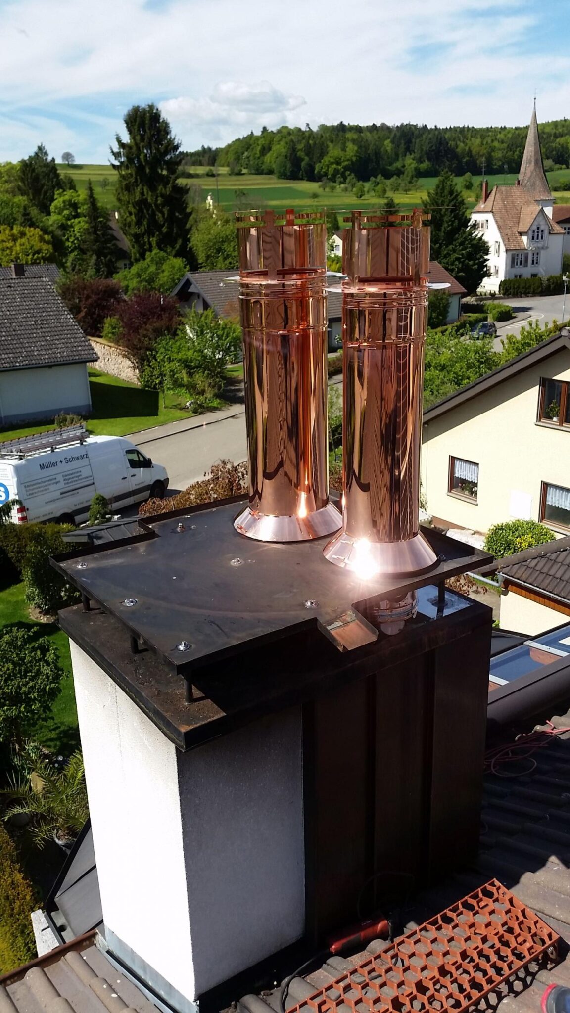 2 doppelwandige Edelstahlschornsteine mit einem kupferfarbenen Außenmantel.