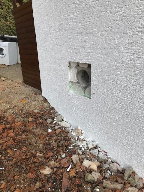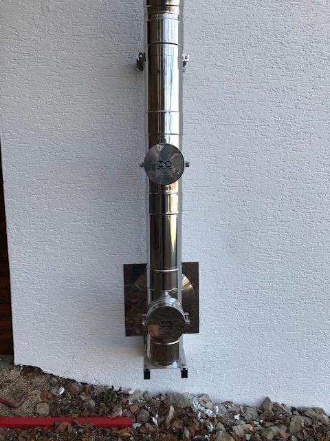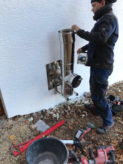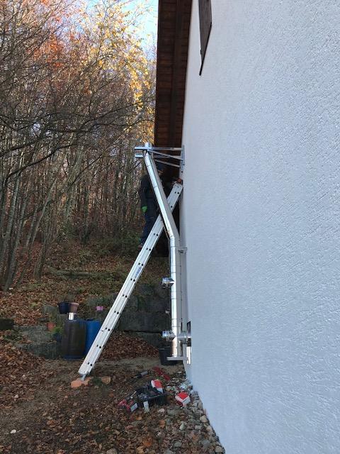 Der Schornstein wurde fachgerecht an der Wandfassade montiert und dann senkrecht an der Fassade nach oben gebaut.