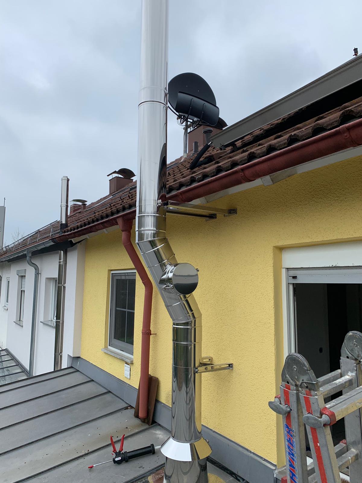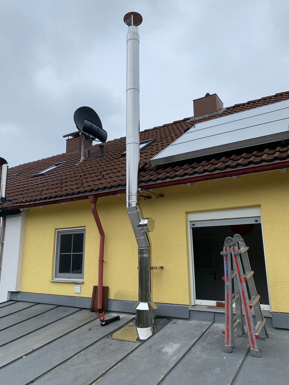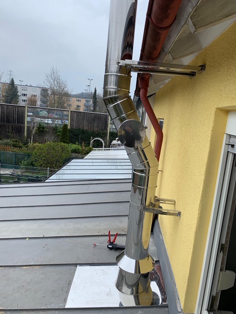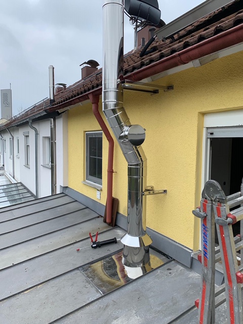 Um nicht auch noch das Hausdach durchdringen zu müssen, wurde der Kamin um die Dachkante gebaut. Durch eine Wandhalterung wird der Schornstein stabilisiert und befestigt.