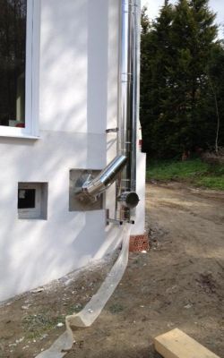 Die Dachkante war für eine Durchführung nicht breit genug, weshalb der doppelwandige Schornstein an ihr vorbeigeführt wurde.