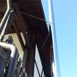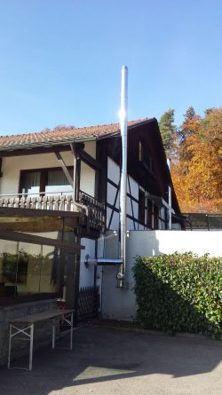 Durch die Wandmontage an der Mauer konnte der Schornstein problemlos bis zum Dachvorsprung hochgezogen werden. Somit musste die Dachhaut auch nicht durchtreten werden.