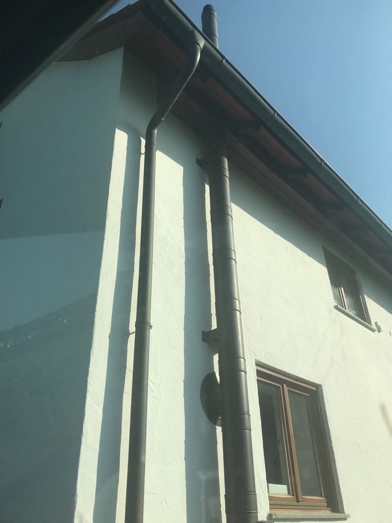 Dies harmoniert gut mit der ebenfalls dunklen Regenrinne des Hauses.